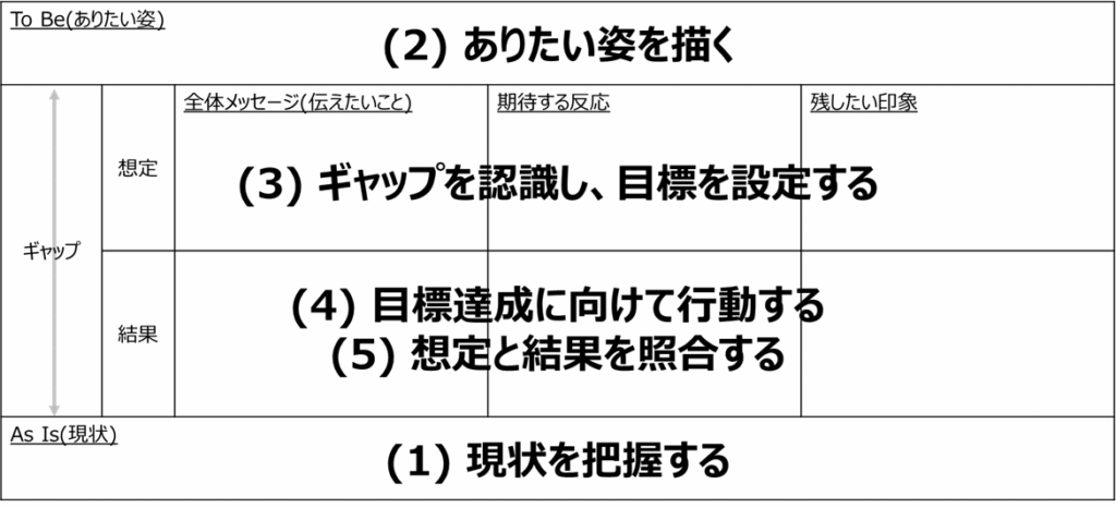図1に本事例を当てはめたものが図2です。部目標を目指してよりよい状態に向かっているというありたい姿に対し、現状は、計画策定は済んだものの施策実行には至っておらず、ギャップが存在しています。このギャップを埋めるために、部長への中間報告では、部ならではのアプローチが見えてきたことを伝え、部長からどのような反応が返ってくるか、部長にどのような印象を残したいのかを事前に想定しておきます。報告会終了後、想定と結果を比較すれば、メッセージが伝わったかどうかを検証することができます。